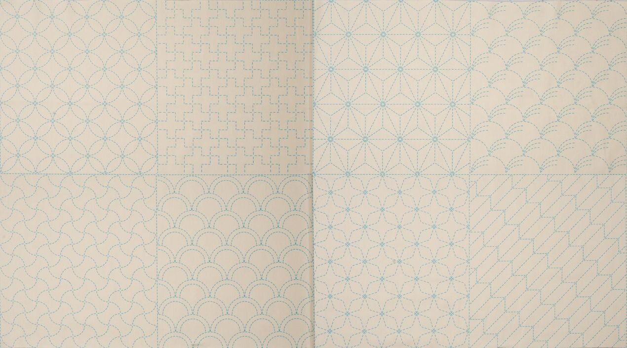 Japonská bavlněná látka na sashiko v režné bílé barvě s předtištěnými vzory. Jeden kus odpovídá jednomu panelu látky o šířce 108 cm a délce 60 cm, kde je všech osm vzorů. Využijete na procvičení více vzorů a ušití sashikových drobností. Potisk pro vpichy jehlou se odstraní vypráním.