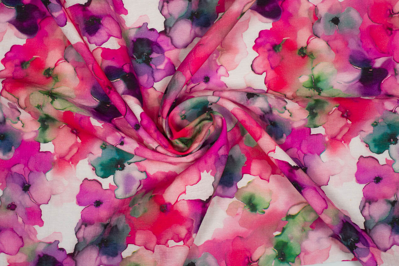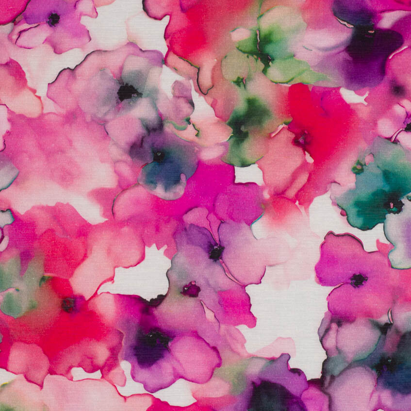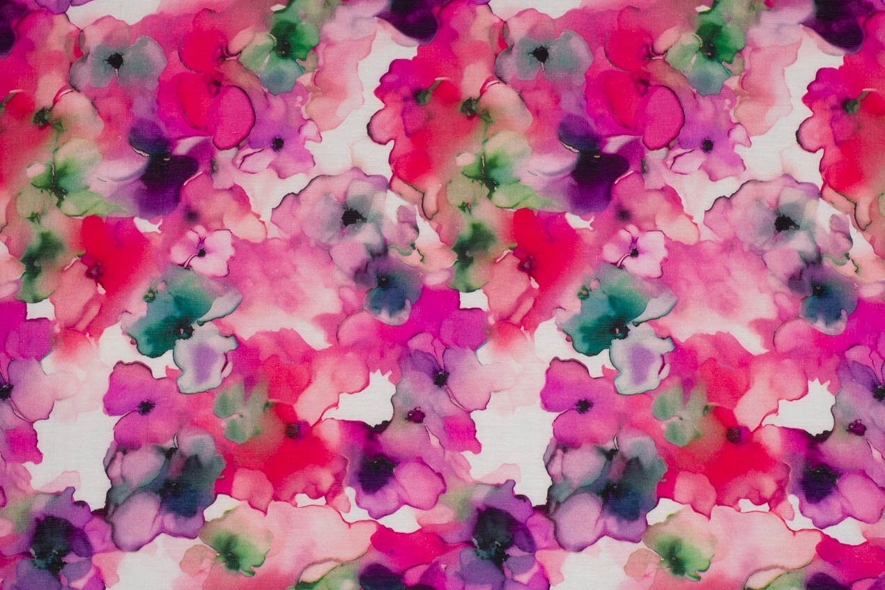 Lehká směsová látka s jemným, matným leskem a elegantní strukturou, kterou jí propůjčuje klasická popelínová vazba. Spojuje příjemnost viskózy, praktičnost nylonu a pevnost lnu – výsledkem je látka, která se krásně nosí, méně se mačká a hodí se na celoroční šatník. Slušet jí budou rozevláté šaty, halenky i pohodlné kalhoty. Látka s růžovým květinovým vzorem.