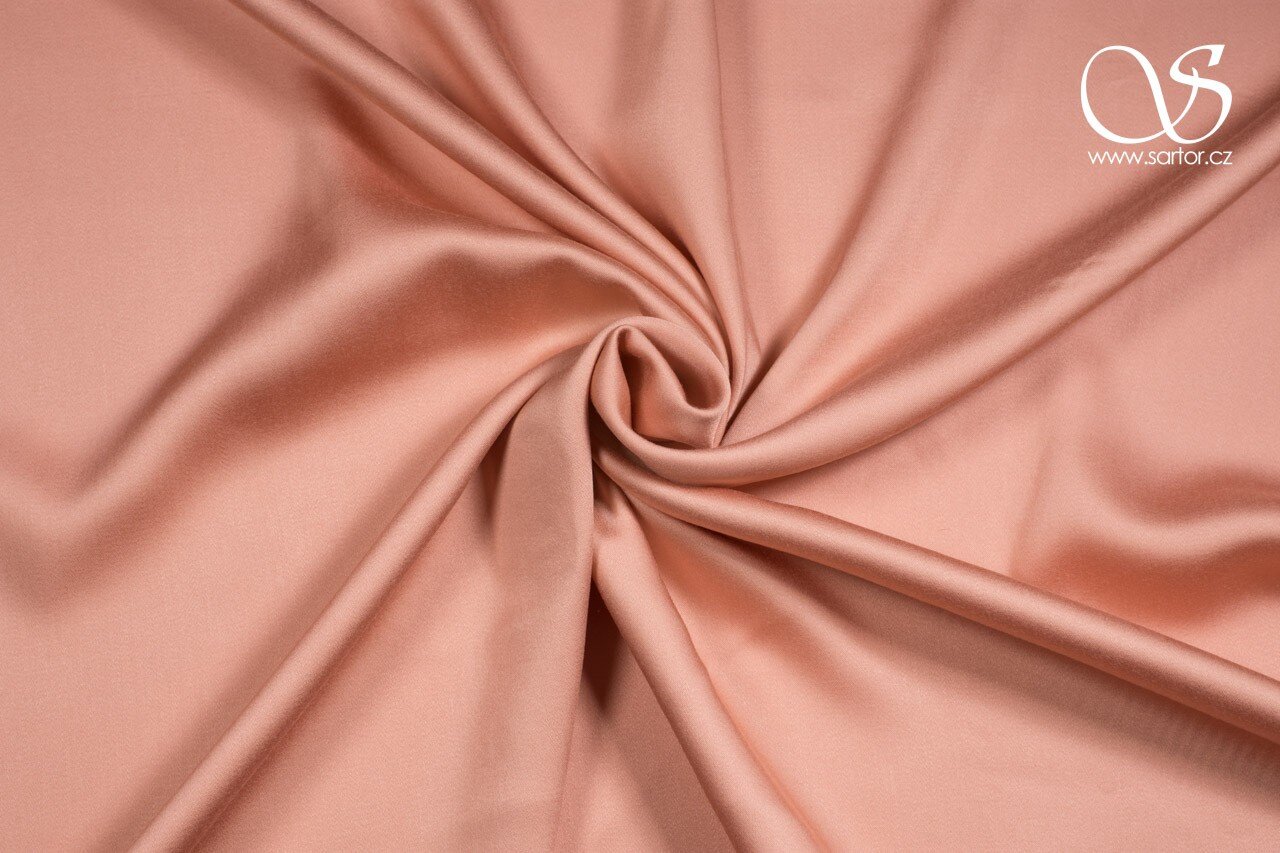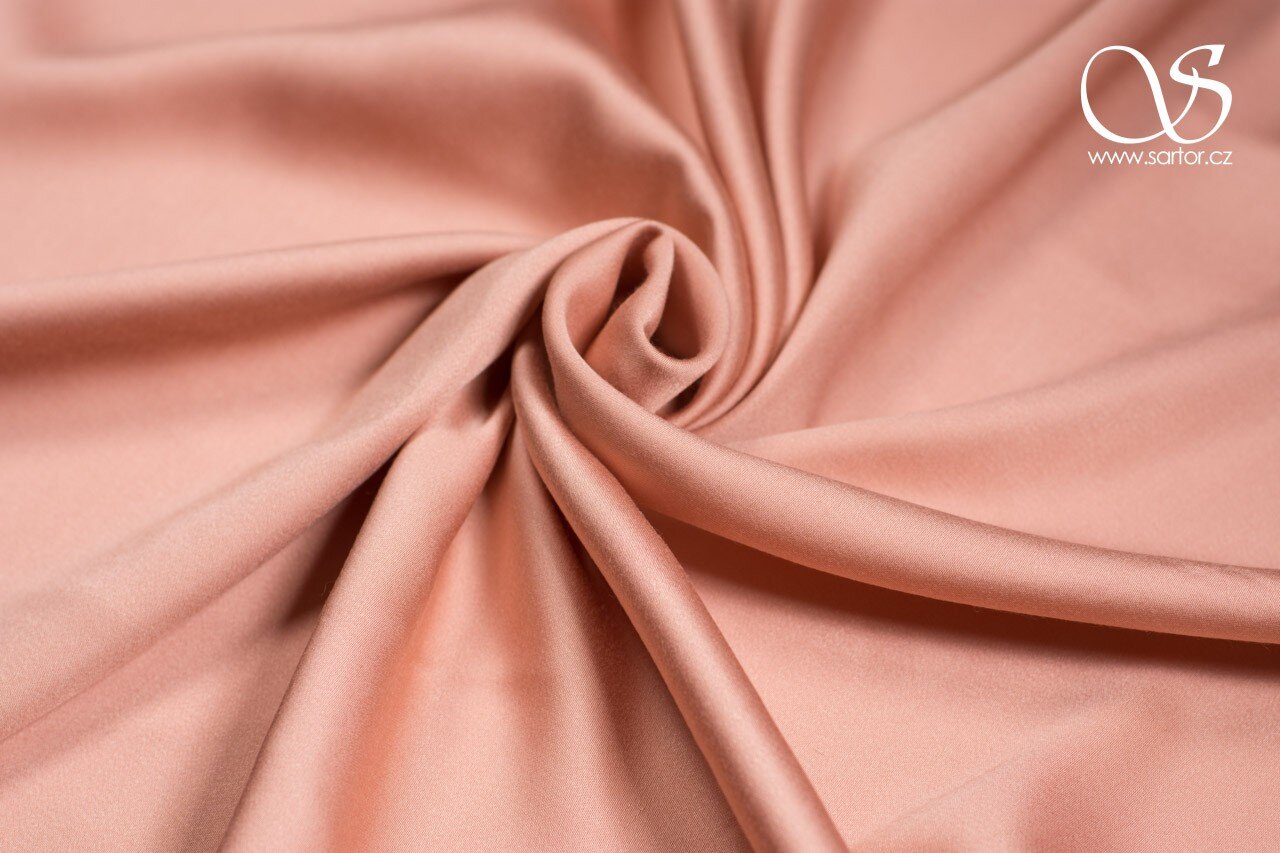 Příjemně hebká, hladká saténová látka s matným leskem v broskvové barvě. Má hladký omak, je mírně pružná a pohodlná na nošení. Výborná na šaty, pláště nebo sukně. Lyocell je vyráběn z přírodních materiálů a jeho výroba je šetrná k životnímu prostředí.