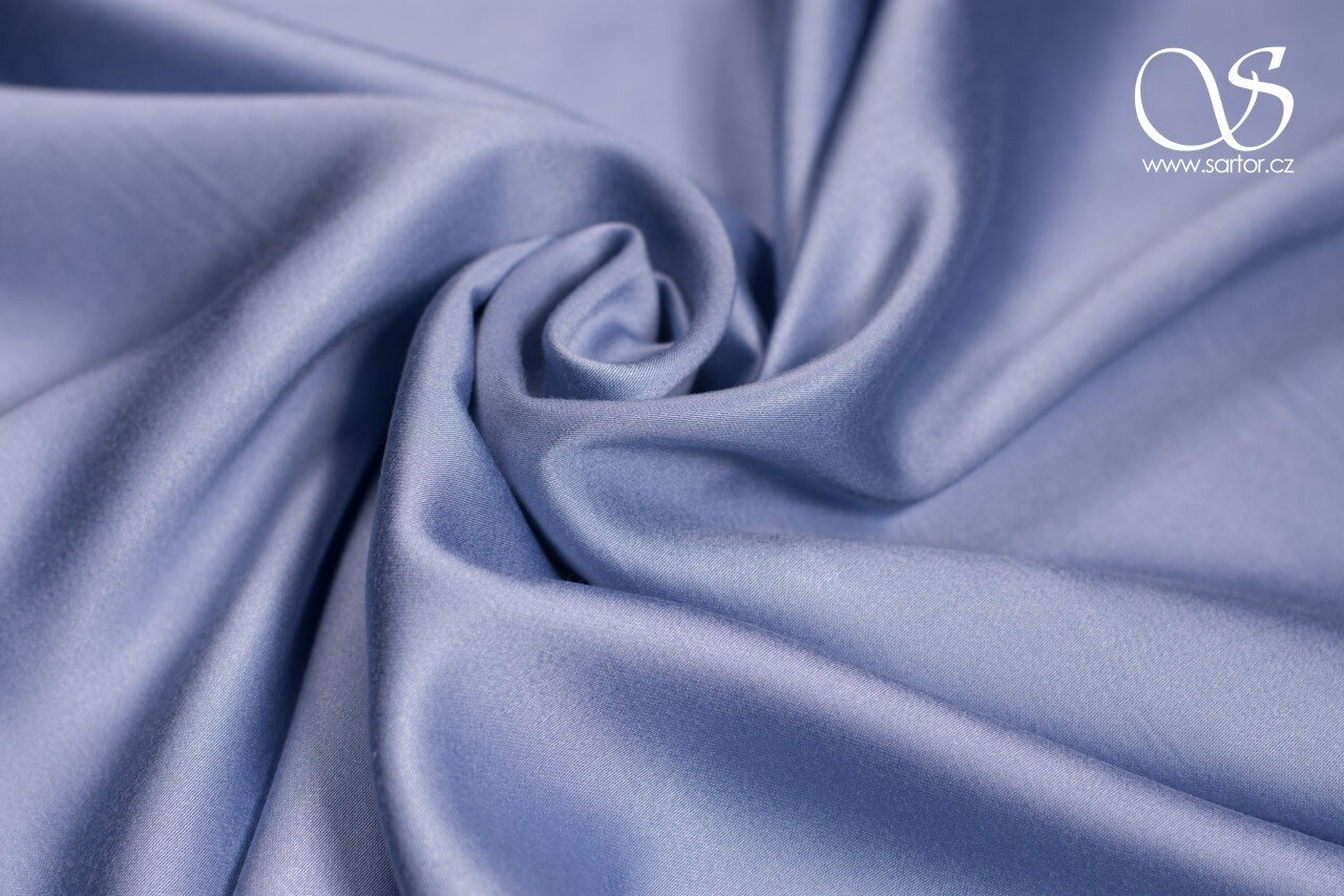 Příjemně hebká, hladká saténová látka s matným leskem ve světle modré barvě. Má hladký omak, je mírně pružná a pohodlná na nošení. Výborná na šaty, pláště nebo sukně.