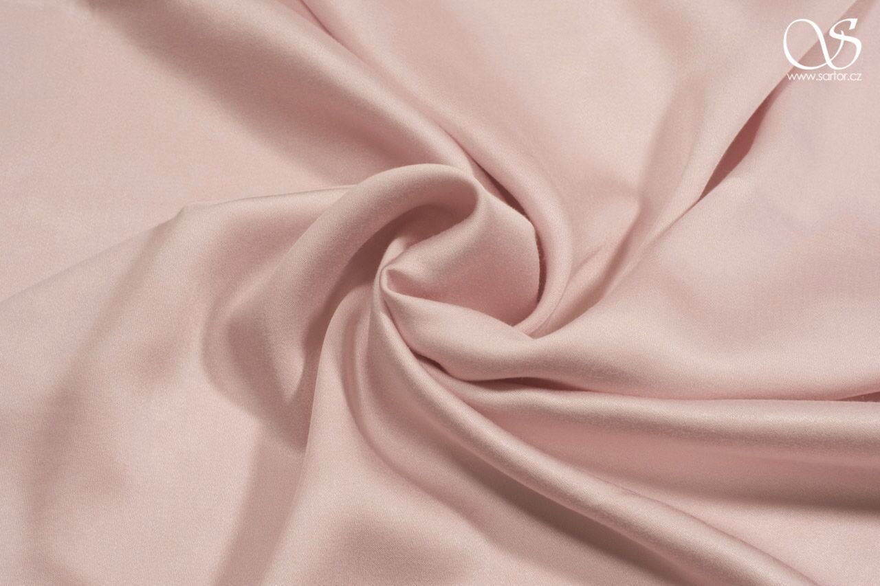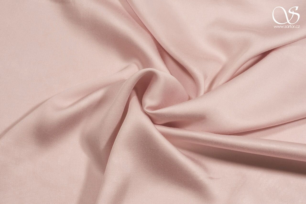 Příjemně hebká, hladká saténová látka s matným leskem ve světle růžové barvě. Má hladký omak, je mírně pružná a pohodlná na nošení. Výborná na šaty, pláště nebo sukně.