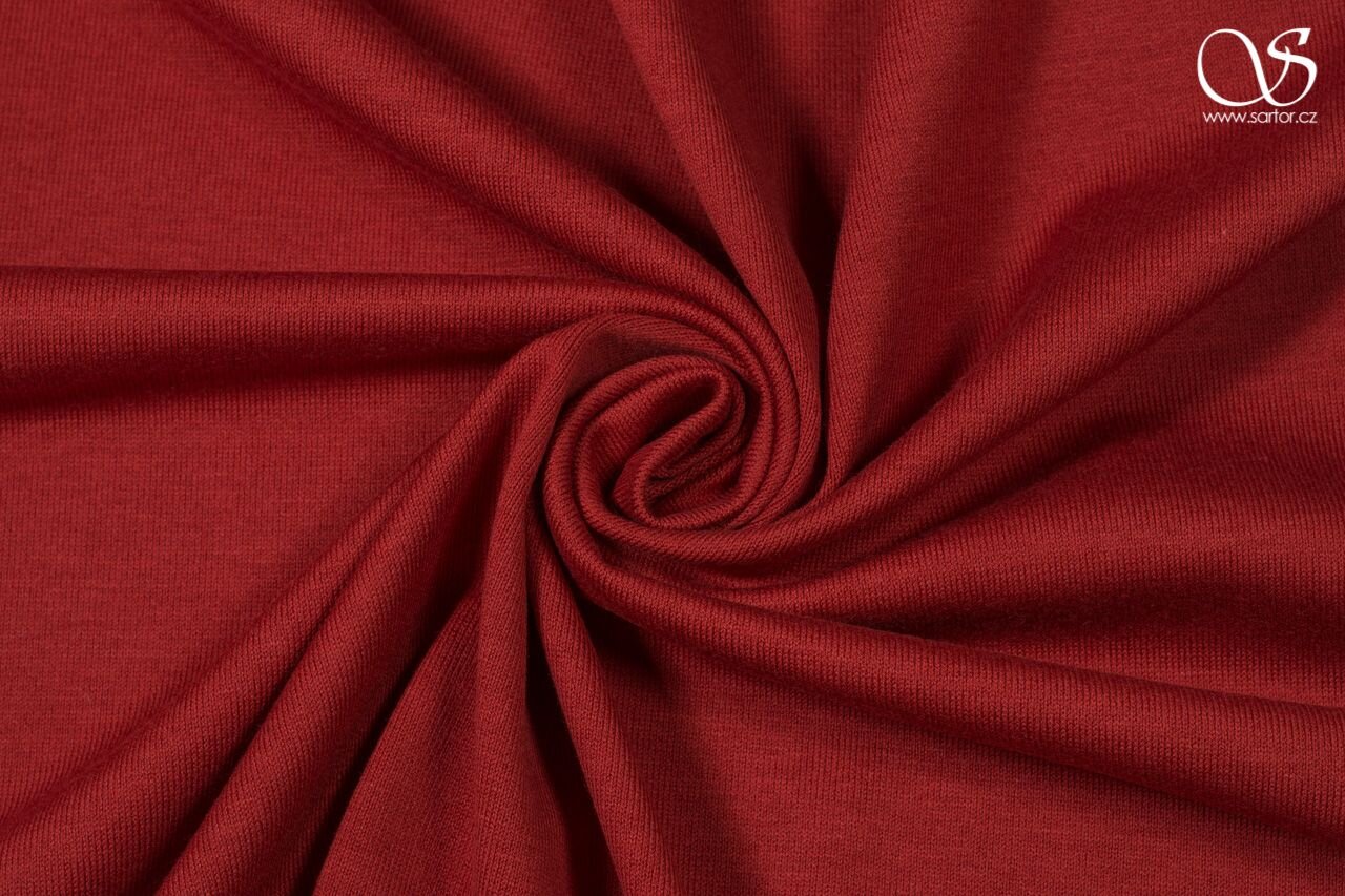 Modal je jemný, měkký přírodní materiál podobný viskóze, ale s lepšími parametry. Skvěle se nosí, je prodyšný, dobře saje vlhkost a udržuje příjemné mikroklima. Tento rezavý modalový úplet má výraznější strukturu (na pohled připomíná finerib – jemné žebro), je pevný a dobře drží tvar. Doporučujeme ho na každodenní oblečení: trička, topy, šaty, legíny, ale také na pohodlné domácí oděvy.