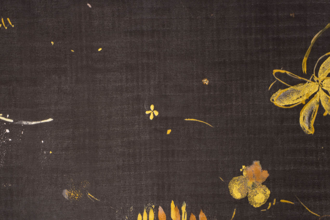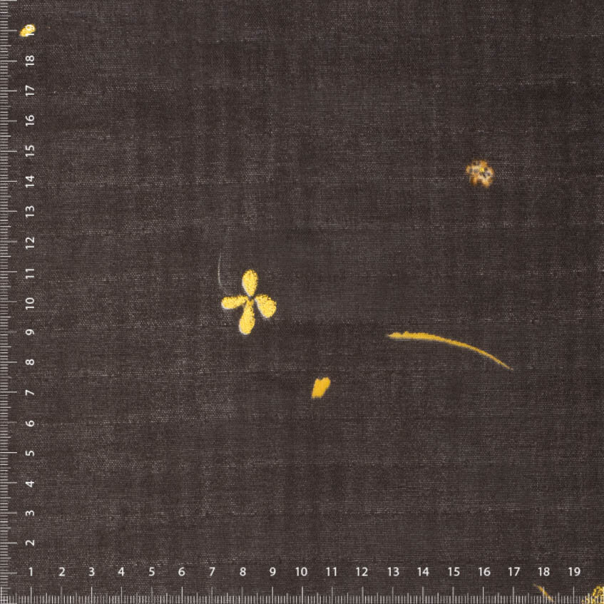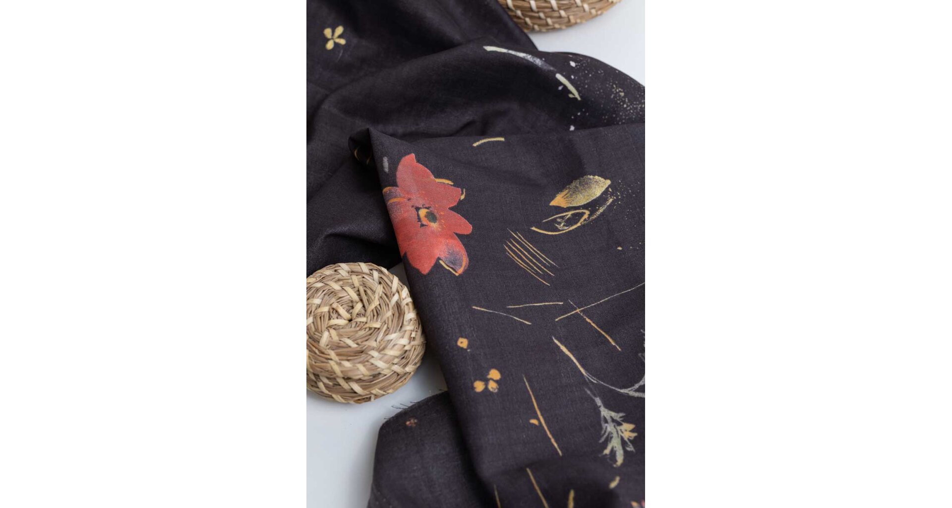 Oryginalny nadruk zatytułowany Hana no toki niwa autorstwa japońskiej projektantki Naomi Ito składa się z akwarelowych kwiatów rzuconych przelotnie na monochromatyczne tło. Między nimi jest wystarczająco dużo miejsca, aby mogły oddychać, a ich żywe, wesołe kolory wyróżniały się.