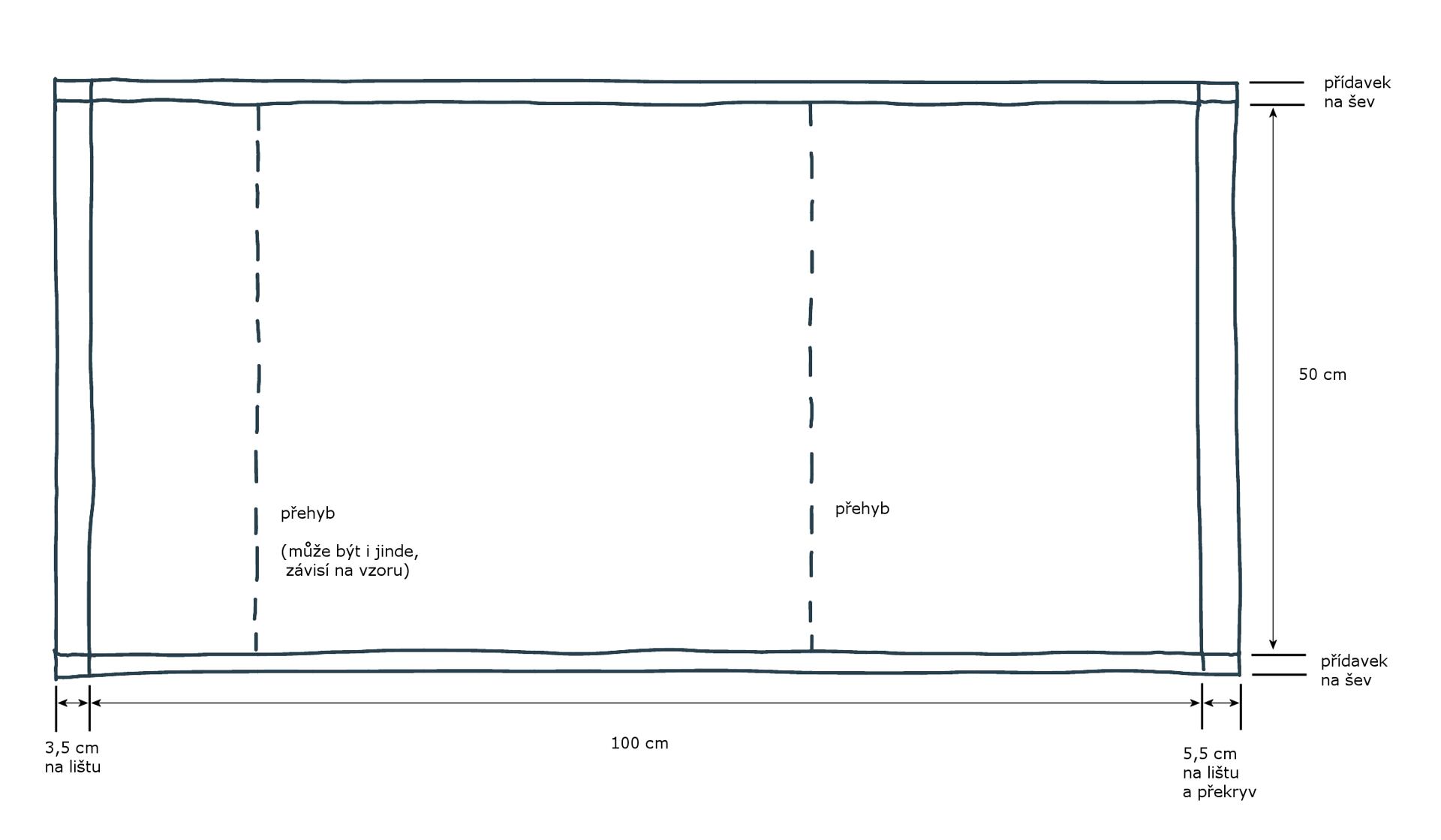 Na jednu lištu tak potřebujete 3,5 cm (1,5 cm přijde založit dovnitř, zbylé 2 cm budou tvořit samotnou lištu). K tomu je nutné připočítat překryv – lišty nejsou vedle sebe, ale horní lišta zakrývá tu spodní, takže k celkové délce včetně přídavků na lišty musíte přidat ještě 2 cm navíc.