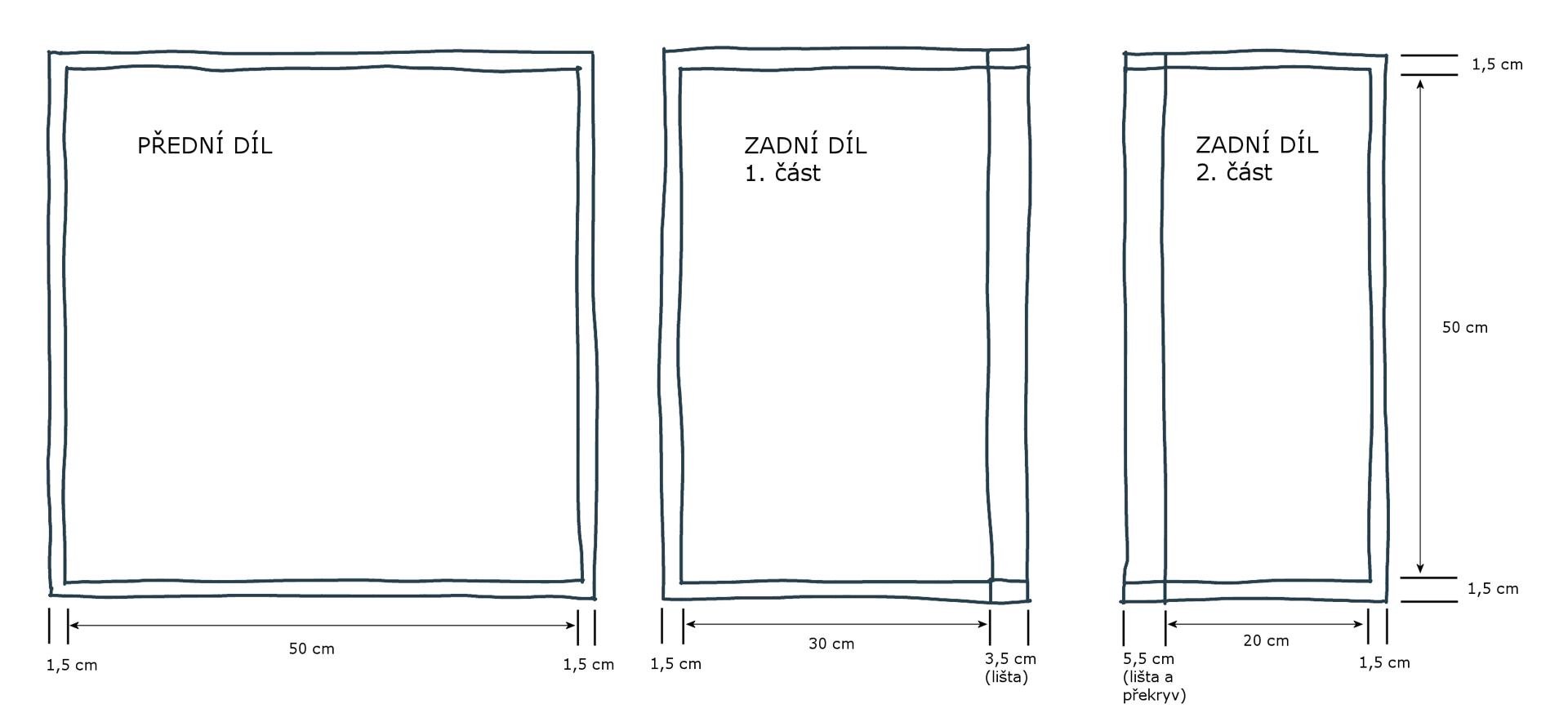 Povlak, který si v tomto návodu ušijeme, bude mít klasické polštářkové zapínání. Tvoří ho dvě překrývající se lišty. Dávají se na zadní stranu, obvykle zhruba do čtvrtiny nebo třetiny šířky (nebo délky, o tom rozhodne položení střihu na látku).