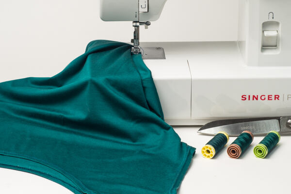 Šijete-li univerzální nití, musíte pro olemování použít pružný steh. Některé stroje mají těchto stehů více, můžete si tedy vybrat i takový, který bude působit ozdobně. Volte spíše řidší (delší) stehy, aby se látka příliš nezvlnila. Mírné zvlnění nevadí, zmizí po vyžehlení.