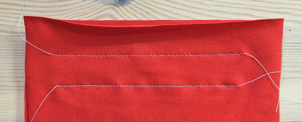 Jestliže šijete pružnou nití, zažehlete si záložku do rubu. Okraj záložky buď začistěte (entlem, overlockem), nebo jej podhrňte do rubu. Prošijte rovným stehem.