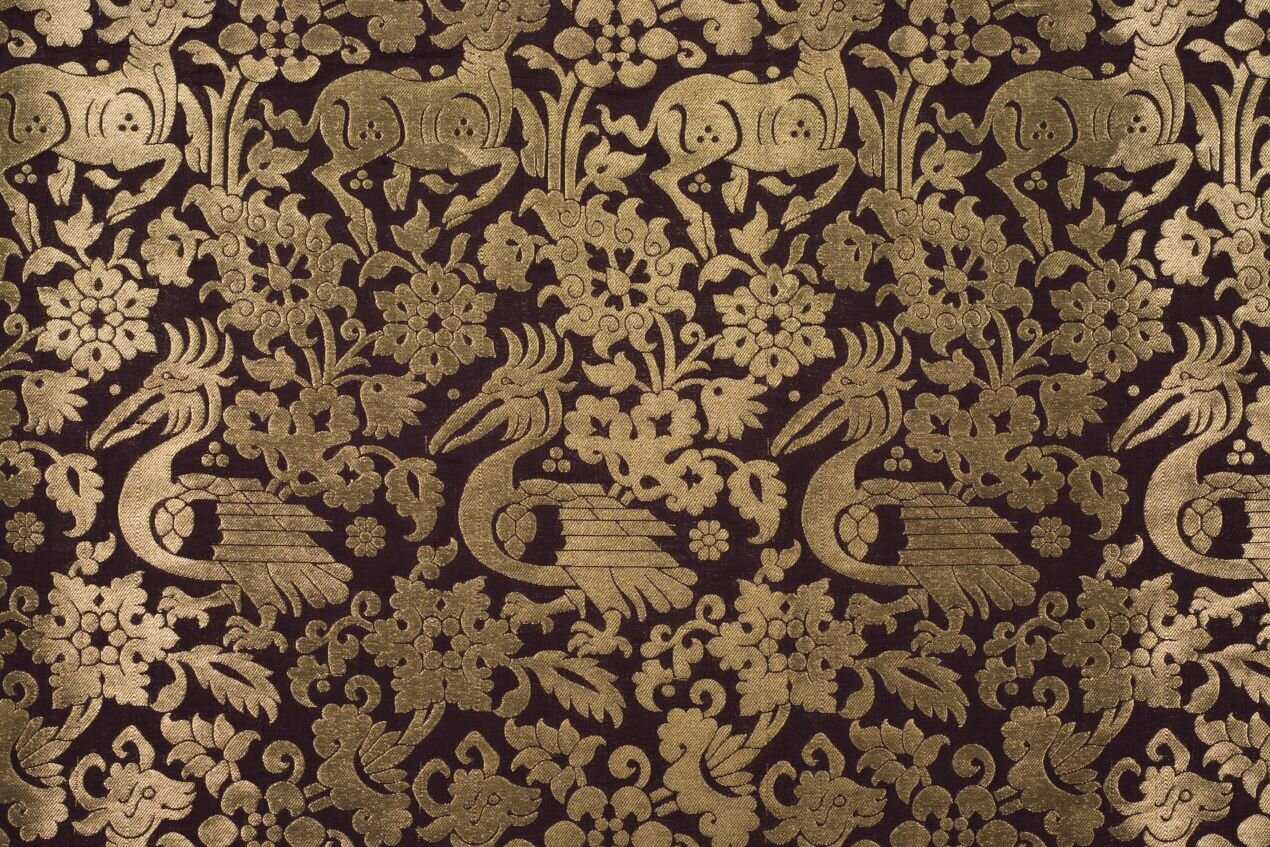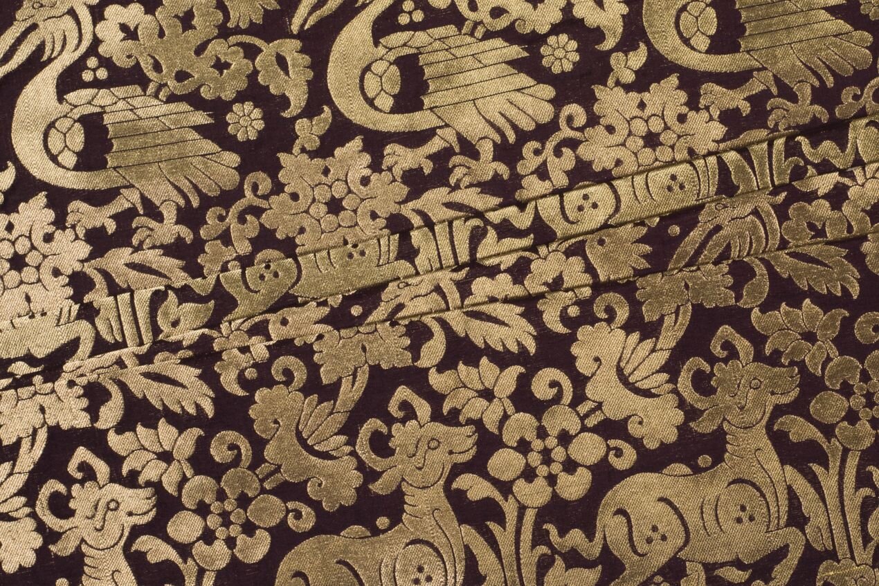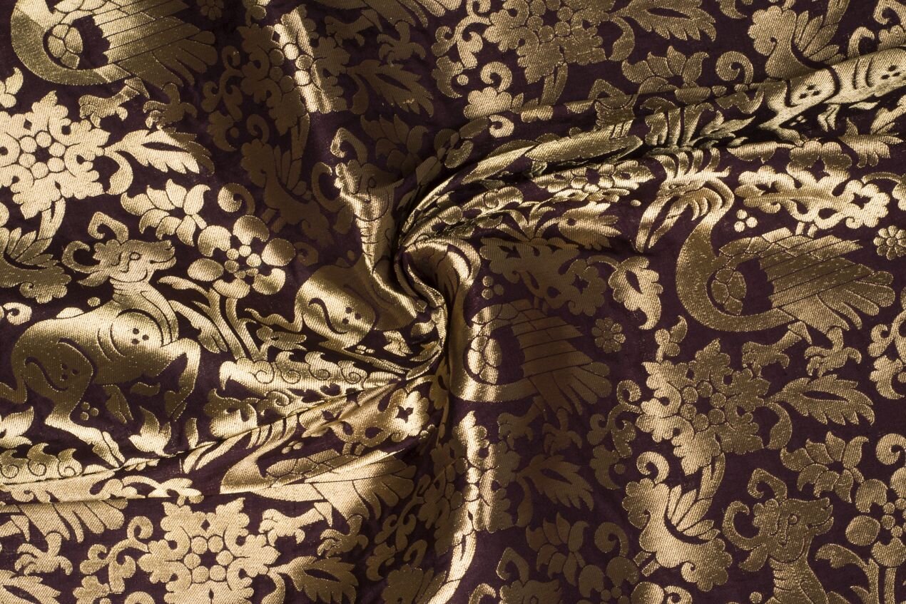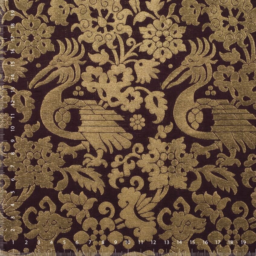 Replika perského brokátu z 11. - 14. století, utkaná z přírodního hedvábí a skutečných metalických nití. Zlatý vzor na purpurovém pozadí. Hodí se nejen na šití historických kostýmů, ale i do luxusních interiérů a ozvláštnění současné módy.