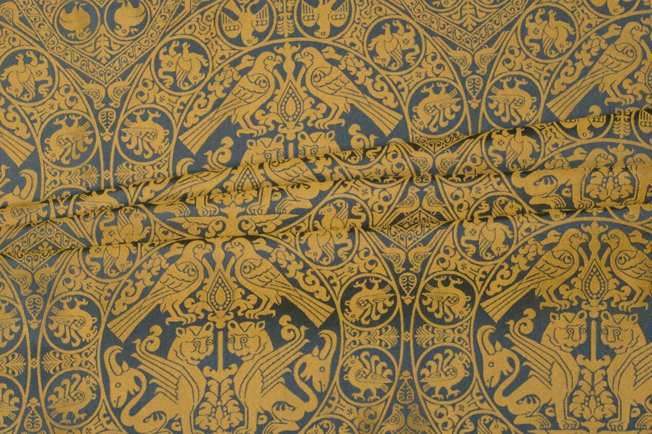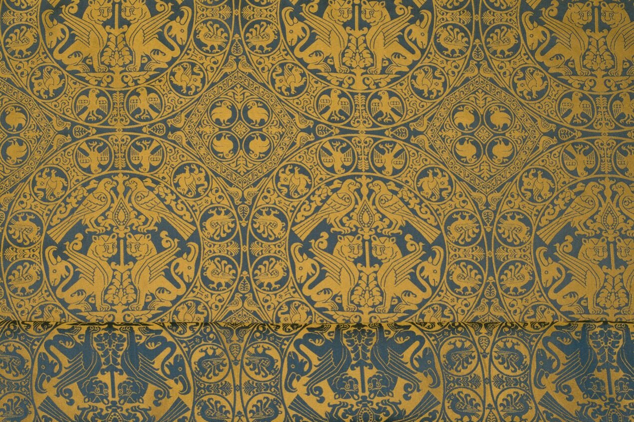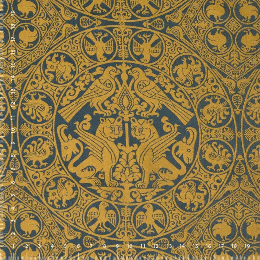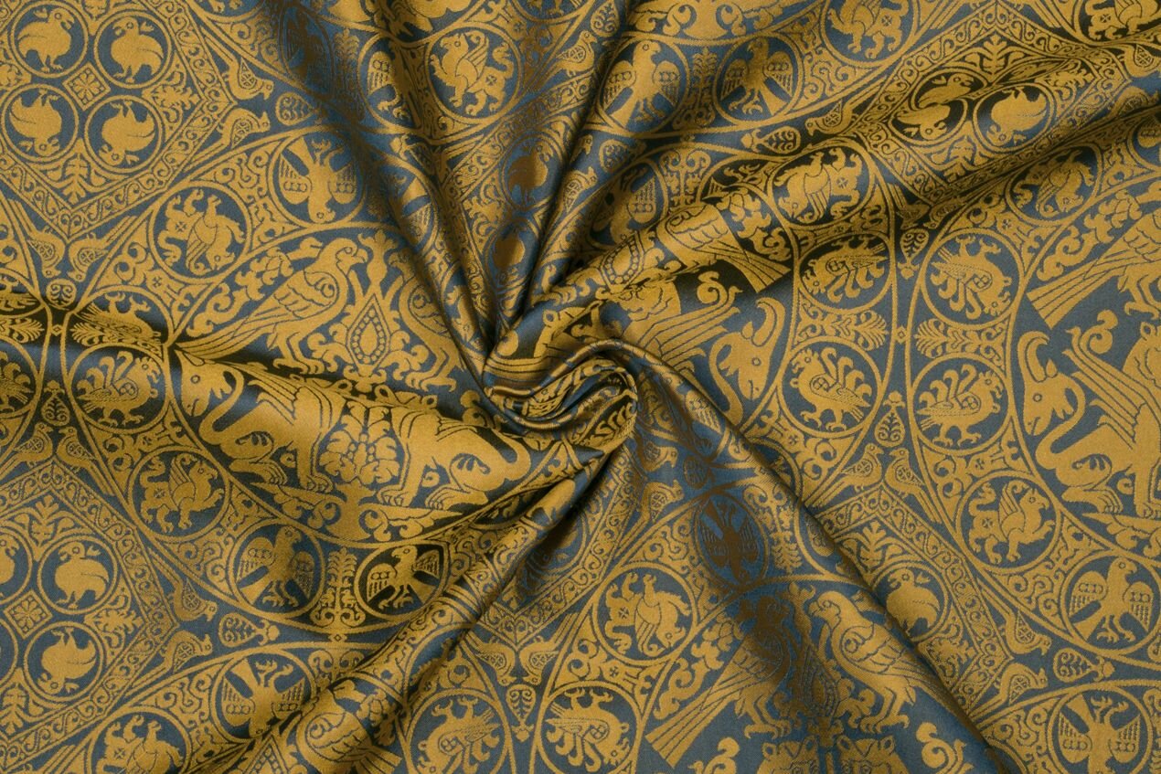 Luxusní replika perského damašku z 11. století, utkaná z přírodního hedvábí. Látka má zlatý vzor na modrém pozadí. Hodí se nejen na šití historických kostýmů, ale i do luxusních interiérů a k ozvláštnění současné módy.