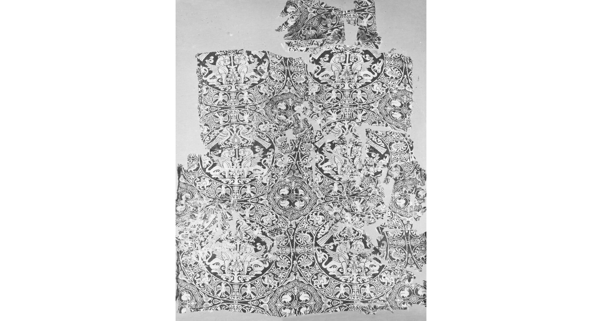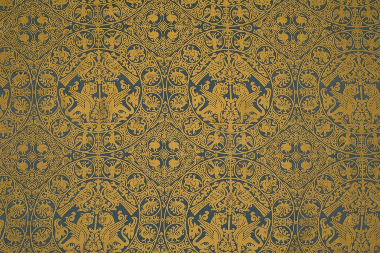 Tento detailně propracovaný vzor, plný motivů a symboliky z raně islámské Persie, pochází z období, kdy bylo ještě povoleno zobrazování zvířat. Středověké dílny perského a mezopotámského hedvábnictví si uchovaly mnohé prvky staroíránské a staroorientální tradice, včetně motivů lovců lvů, zvířecích bojů a loveckých scén. I po islamizaci Perské říše tkalci, alespoň zpočátku, pokračovali v používání původních sasánských vzorů, což potvrzují i dochované tkaniny.