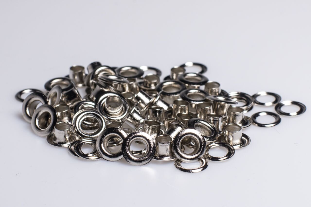 Mosazné průchodky s povrchovou úpravou, vhodné pro zpevnění šněrovacích dírek na korzetech a jiných oděvech.