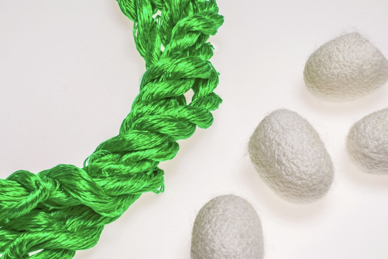 Motek miękkiej przędzy z naturalnego jedwabiu w kolorze zielonym, odpowiedniej do haftu.