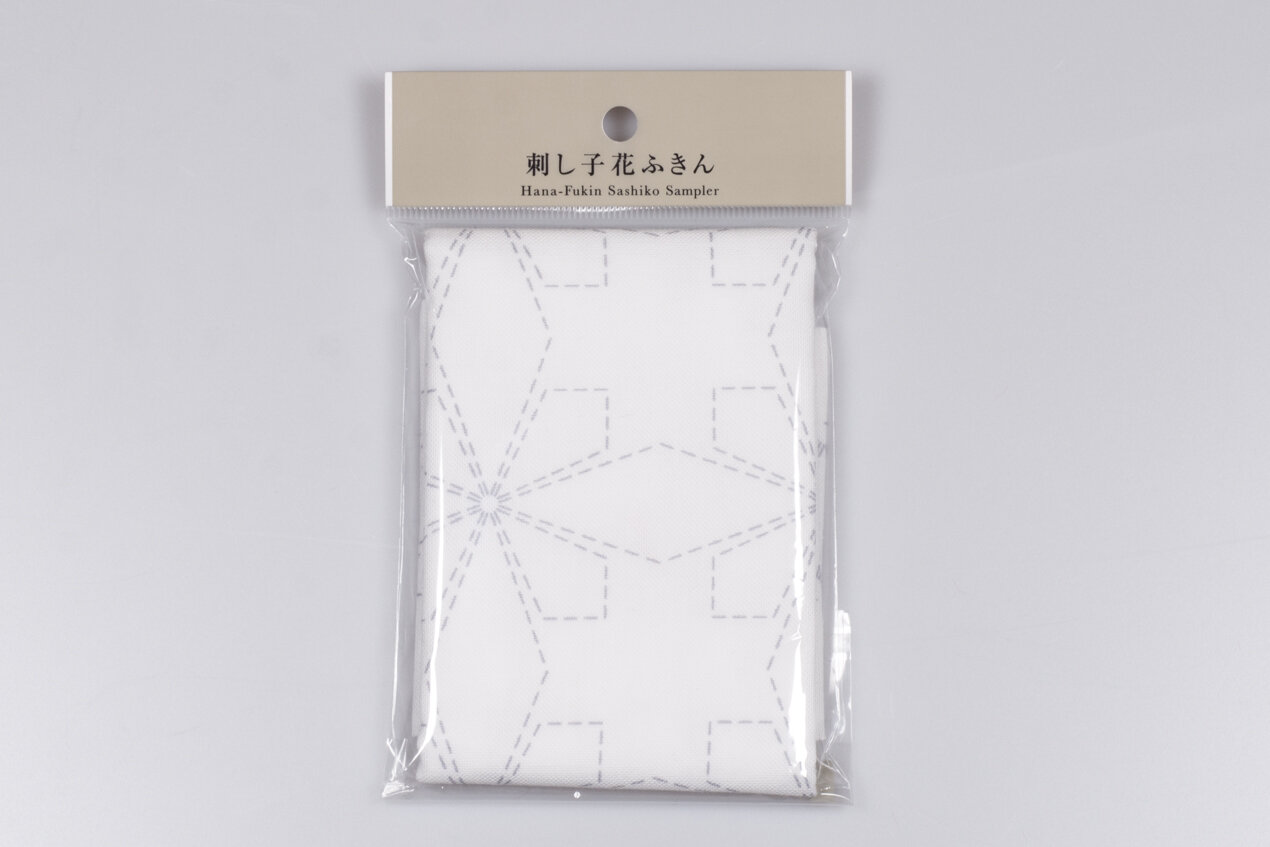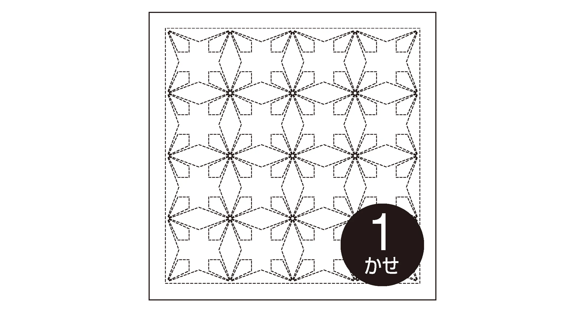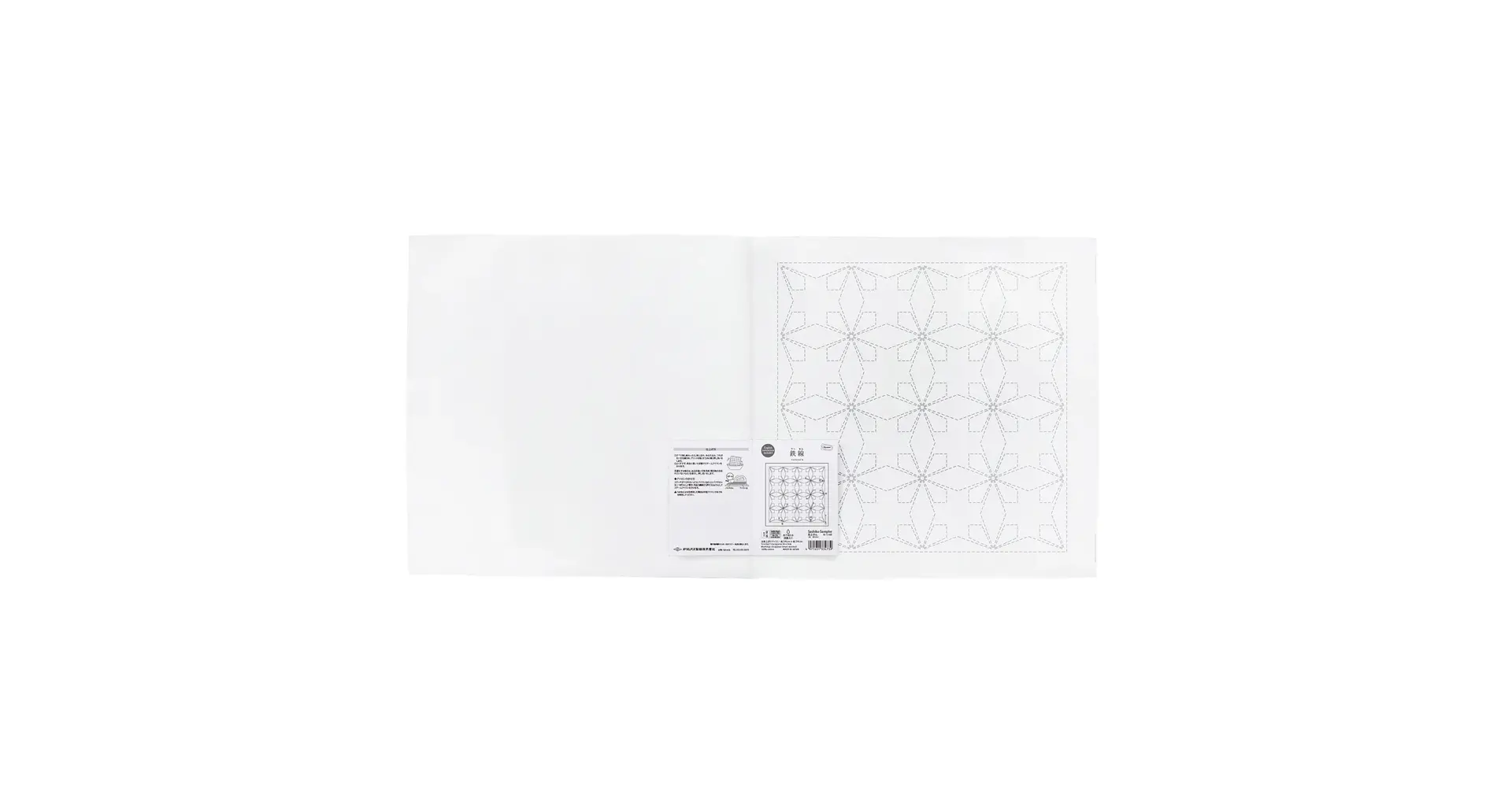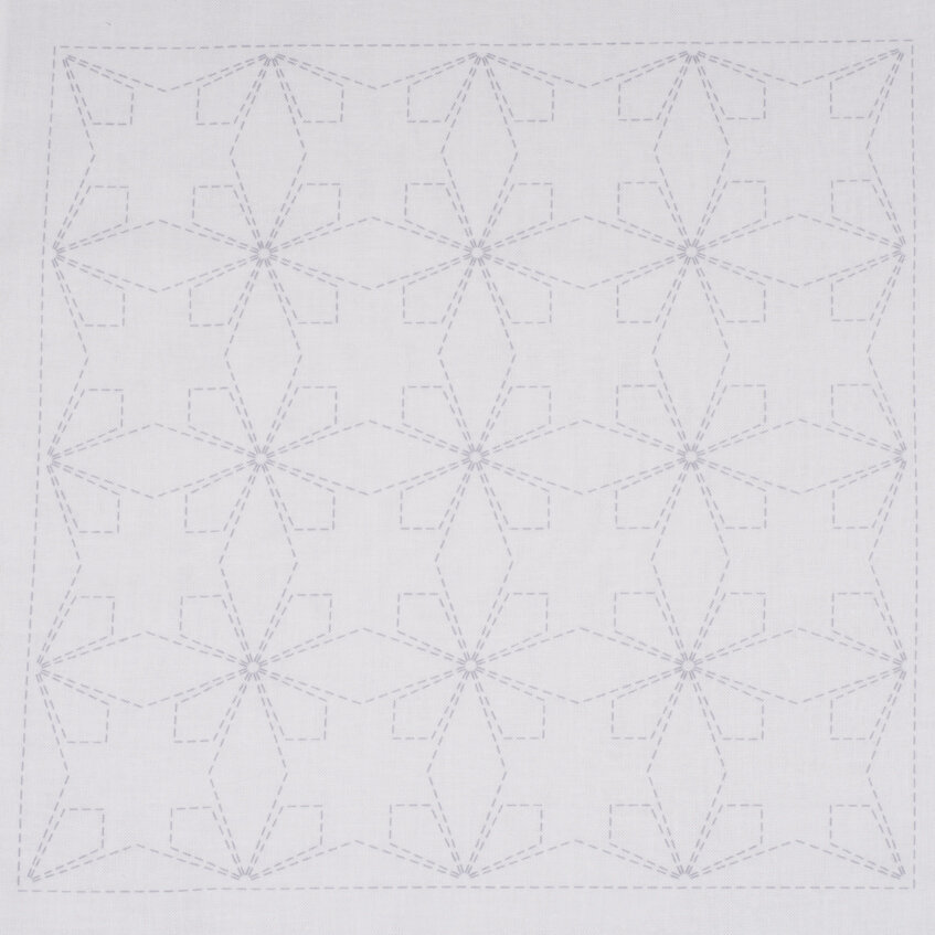 Předtištěná látka na japonskou techniku proševu sashiko ve velikosti tradiční japonské utěrky hana-fukin. Na jedné polovině bílé látky je smyvatelný vzor, druhá polovina slouží k založení rubu. Po vyšití a sešití získáte krásnou oboustrannou utěrku s čistým vzhledem z líce i rubu.