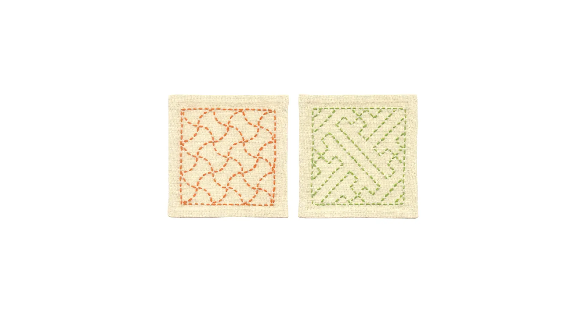 Sada na dva malé sashiko čtverce. Obsahuje světlou látku s předtištěným smývatelným vzorem, přízi ve dvou barvách, jehlu a návod. Vyzkoušejte si techniku sashiko a odměňte se krásnou drobností.