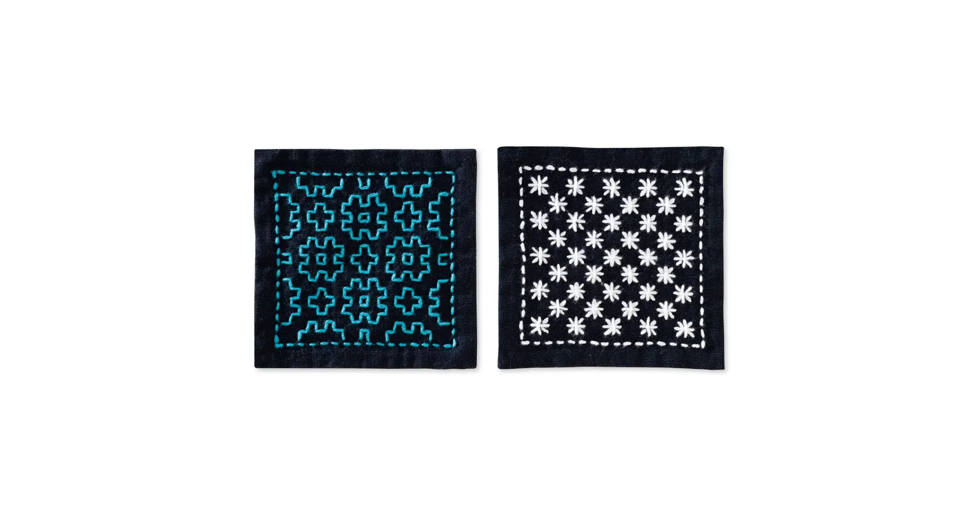 Sada na dva malé sashiko čtverce. Obsahuje indigovou látku s předtištěným vzorem, přízi ve dvou barvách, jehlu a návod. Vyzkoušejte si techniku sashiko a odměňte se krásnou drobností.