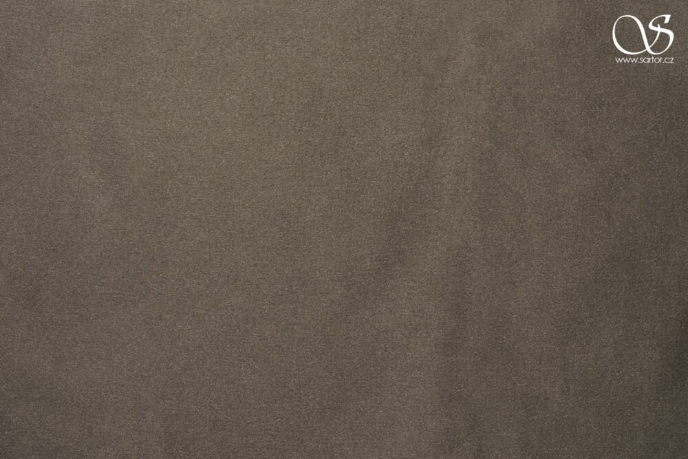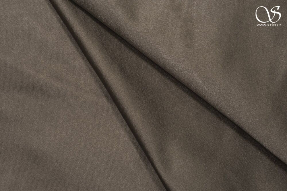 Těžká, nesplývavá, lesklá látka se saténovým leskem v šedé barvě ze směsi viskózy a polyesteru, vhodná na svatební šaty, společenské oděvy nebo interiérové doplňky.