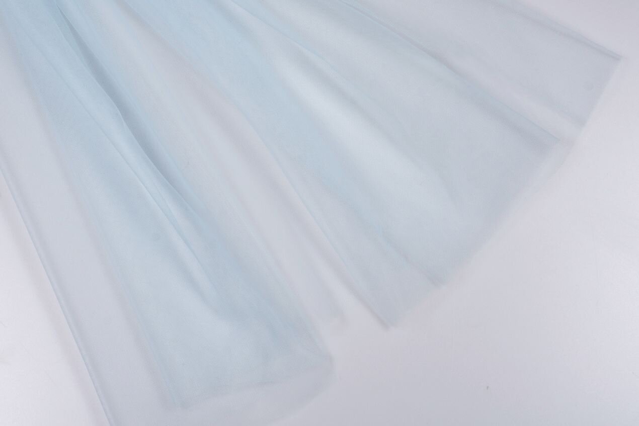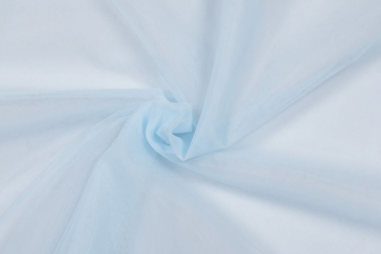 Splývavý matný jemný tyl na šaty i závoje v mimořádné šířce ve světle modré barvě, oblíbený především jako svatební tyl na bohatě řasené závoje, ale vhodný na všechny bohatě nabírané tylové sukně.