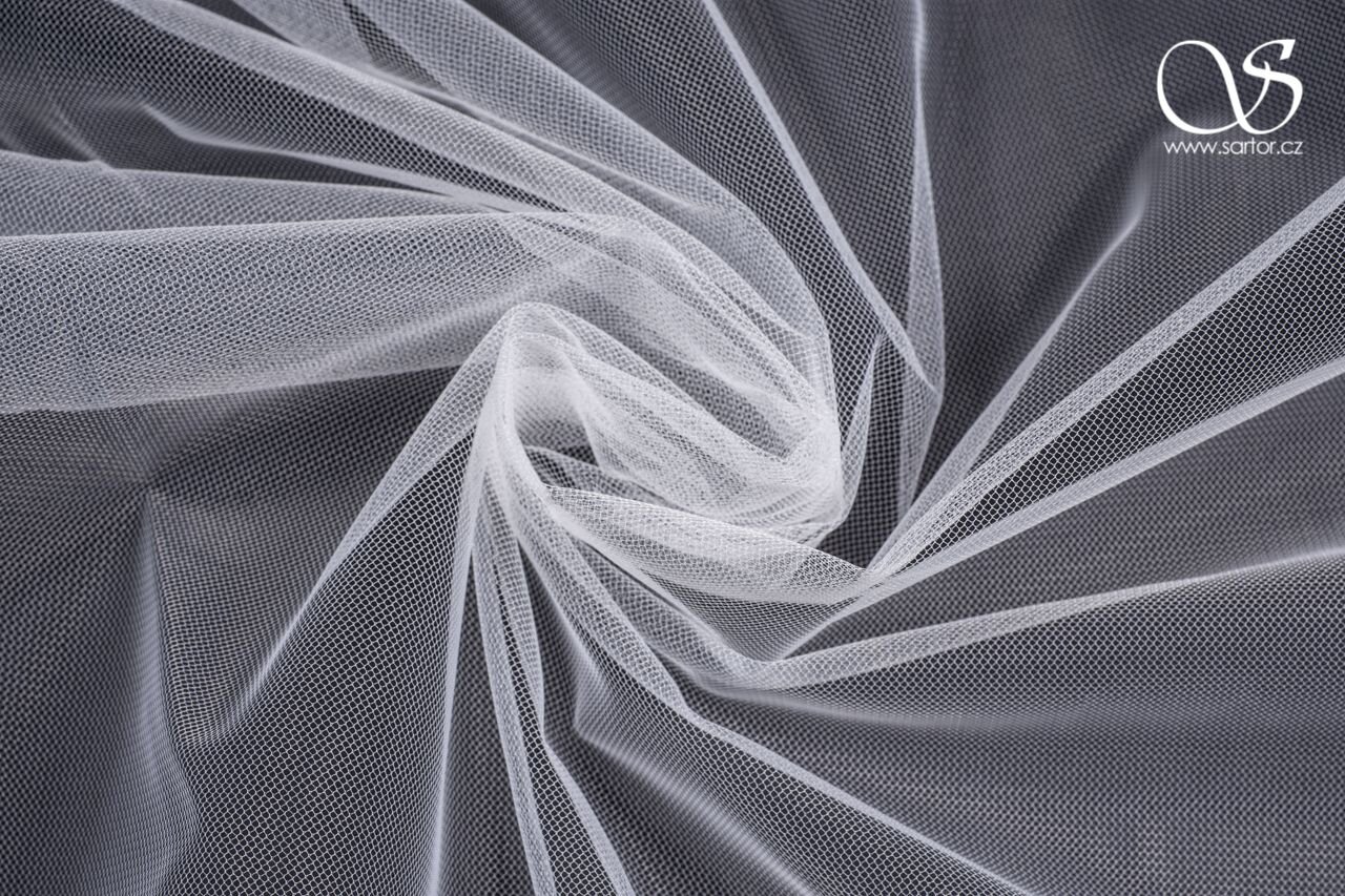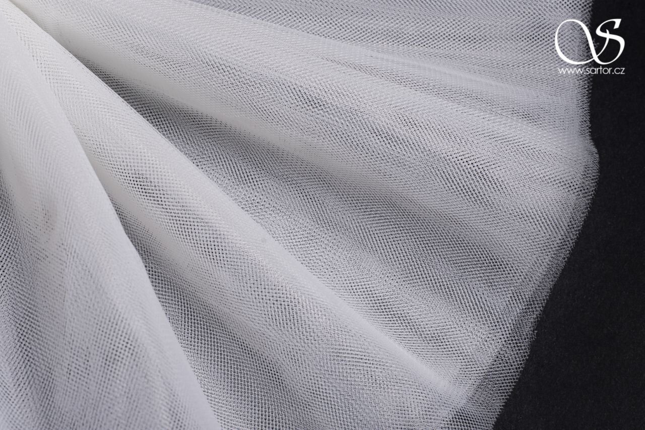 Płynny matowy delikatny tiul do sukienek i welonów w bardzo szerokim neutralnym odcieniu bieli, szczególnie popularny jako tiul ślubny do bogato drapowanych welonów, ale odpowiedni do wszystkich bogato marszczonych tiulowych spódnic.