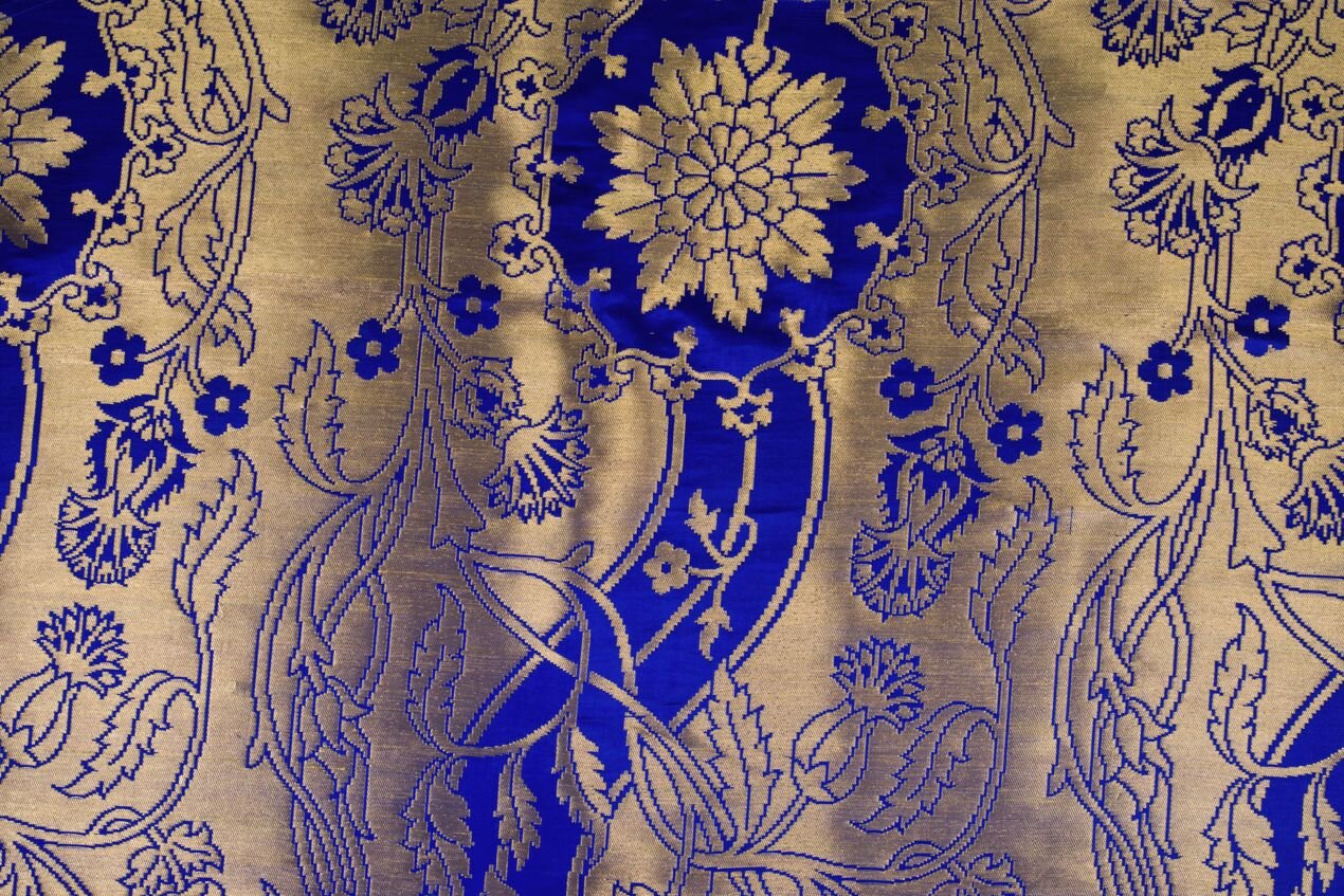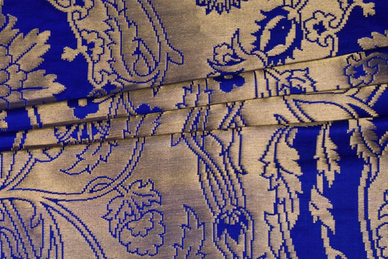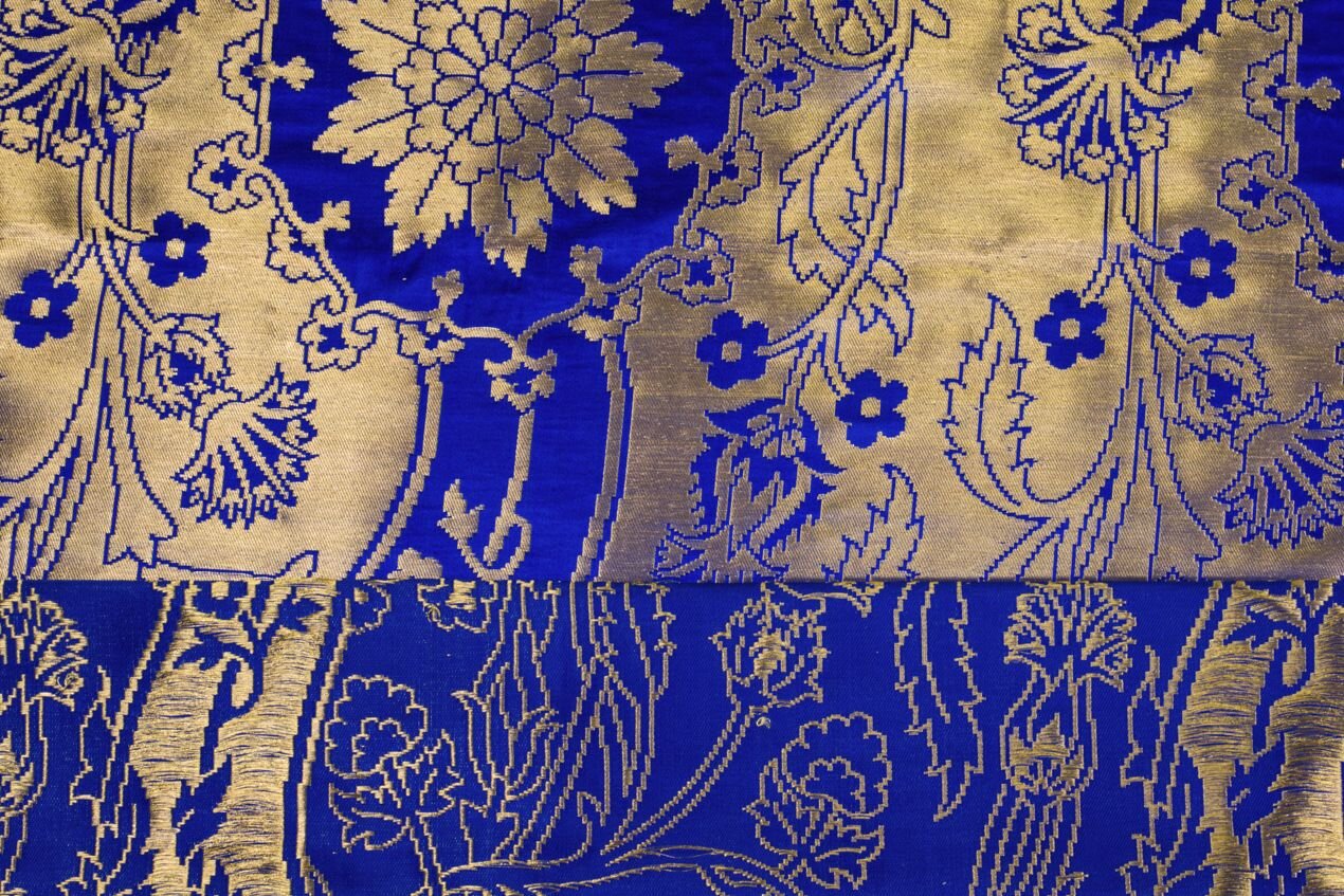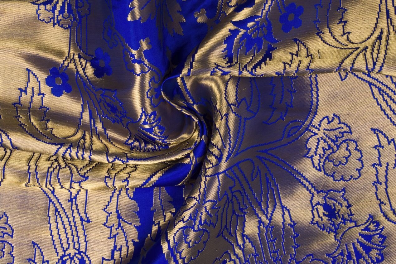 Ručně tkaná replika renesančního brokátu z přírodního hedvábí a skutečných metalických nití navržená podle slavného vlámského renesančního obrazu z 15. století. Modrý vzor na zlatém pozadí. Hodí se nejen na šití historických kostýmů, ale i do luxusních interiérů a ozvláštnění současné módy.
